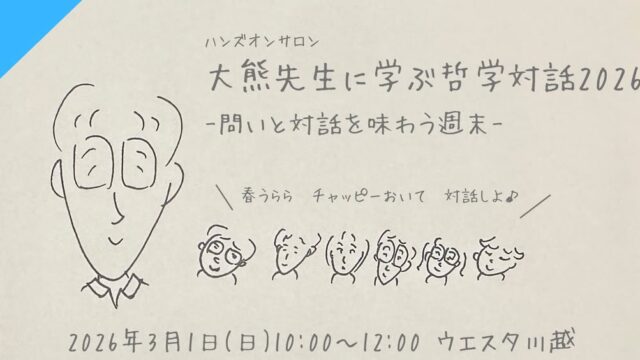 ハンズオンサロン 【満員御礼 受付終了】ハンズオンサロン 教えて!大熊先生「哲学対話」を通じたあたたかい場づくり研Q会 2024年9月8日 hands-on-s 2024年度のハンズオンサロンでは「問いによるあたたかい場づくり」をテーマにみなさんと一緒に体験しながら学び、考える場を持っています。 こ …